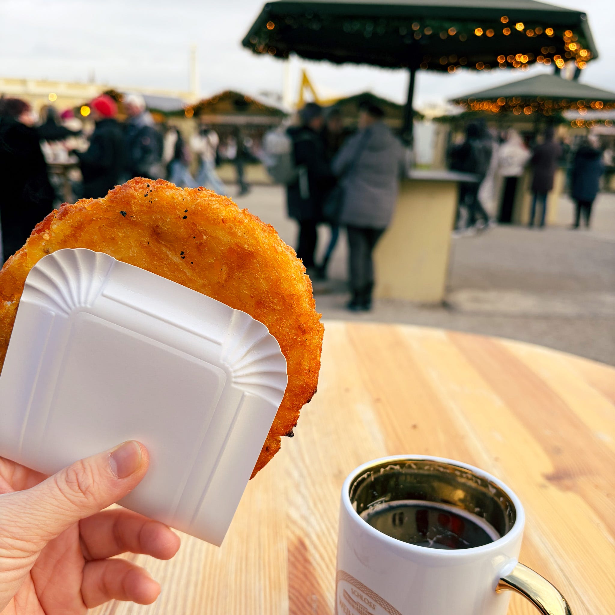 Schönbrunn was where we found the best version of Kartoffelpuffer, a German potato pancake that is ubiquitous at Viennese Christmas markets. Just look for the chestnut roasters with large black barrel stoves, who almost always offer Kartoffelpuffer as well. You can think of them like a fresher, tastier version of McDonald’s hashbrowns, and they come in a similar grab-and-go format which makes them easy to snack on while walking around a market.