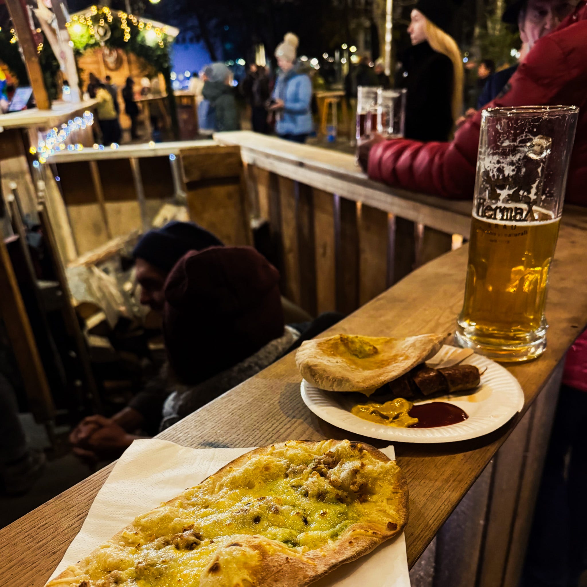 If you’re not familiar with the format of a European-style Christmas market, I highly recommend acquainting yourself. They’re usually found outdoors in city plazas, winding through narrow old city streets, or occasionally indoors in major train stations. They feature anywhere from a few to dozens of wooden stalls selling food, local crafts, and drinks — notably glühwein, the German term for mulled wine — served in souvenir mugs that you can either return for a refund or take home as a souvenir.