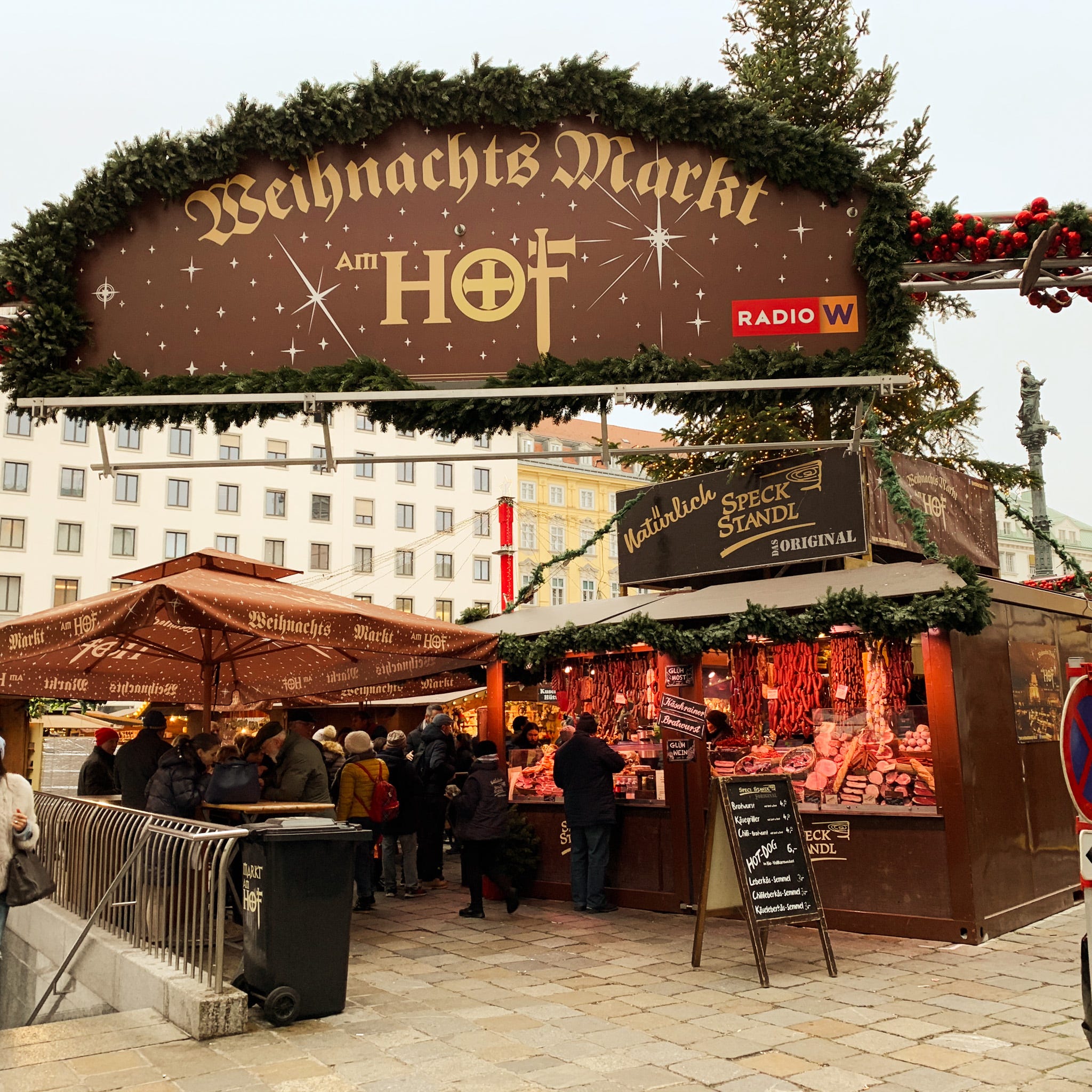 Just two blocks down the street from Altwiener is Am Hof, titled after the plaza of the same name. This market features a few rows of food, drink, and craft vendors, although it’s on the smaller side and can get crowded. The main attraction is an open-air sit-down bar offering a variety of wine and Champagne.