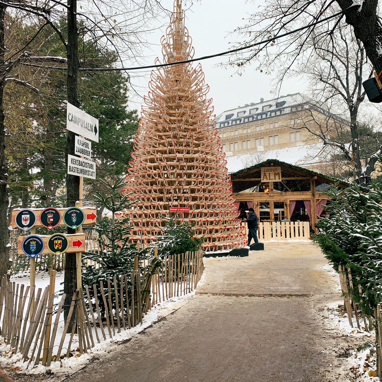 Only a short walk from the Rathausplatz is the Campus der Universität Wien (Vienna University Campus), which hosts its own Christmas market tucked inside one of the University’s courtyards. In addition to the usual outdoor stalls, this market offers a surprisingly robust set of temporary indoor spaces that includes a full bar and fondue chalet. While I do believe standing outside in the cold is an important part of the Christmas market experience, it’s also nice to have the option to duck into these heated spaces for some rest and warmth. When you do venture out into the cold, you’ll find a solid array of food and drink stalls, plus a section of carnival rides for the kids.