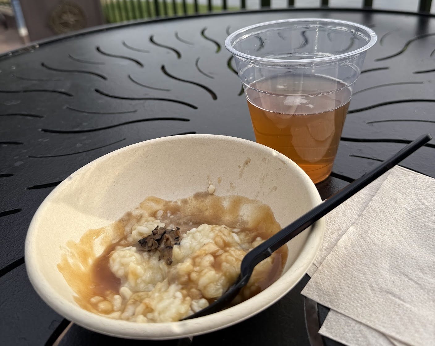 Last up is the Canada pavilion, home to the gorgeously scenic Canada Far and Wide Circle-Vision presentation, as well as a popcorn cart that makes the entire area smell like maple syrup. The drinking options here are a bit limited, although I did enjoy finding a hidden refreshment stand at the back of a gift shop that sells Canadian beer. Fortunately the Festival of the Arts brought with it the Gourmet Landscapes cart, where we ordered a Whole Hog Brewery Raspberry Chéret Double Radler ($9.75) and Wild Mushroom Risotto ($9.75). The Radler wasn’t actually Canadian (it’s brewed in Wisconsin), but it was darkly fruity and hearty, making it feel at home against the backdrop of a Canadian mountain landscape.