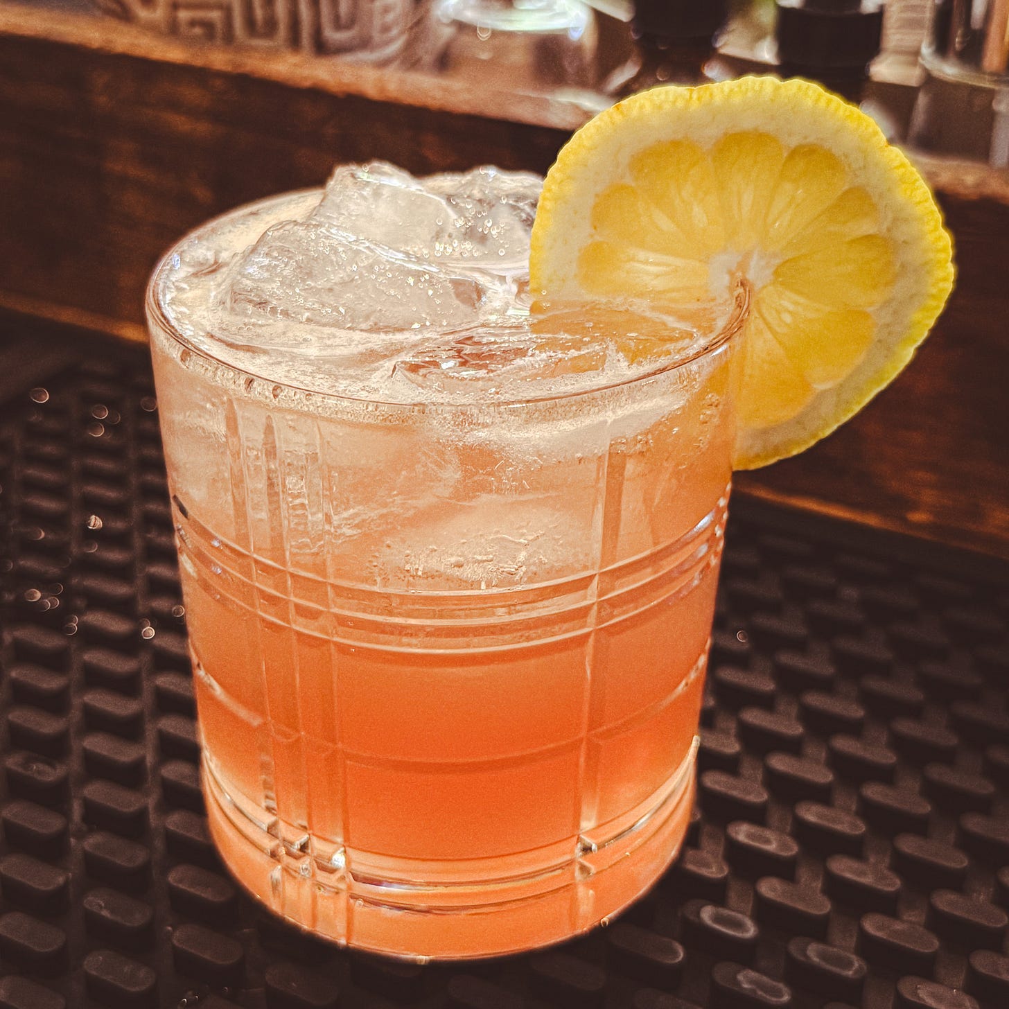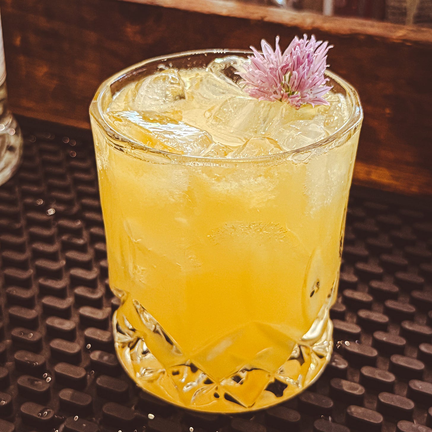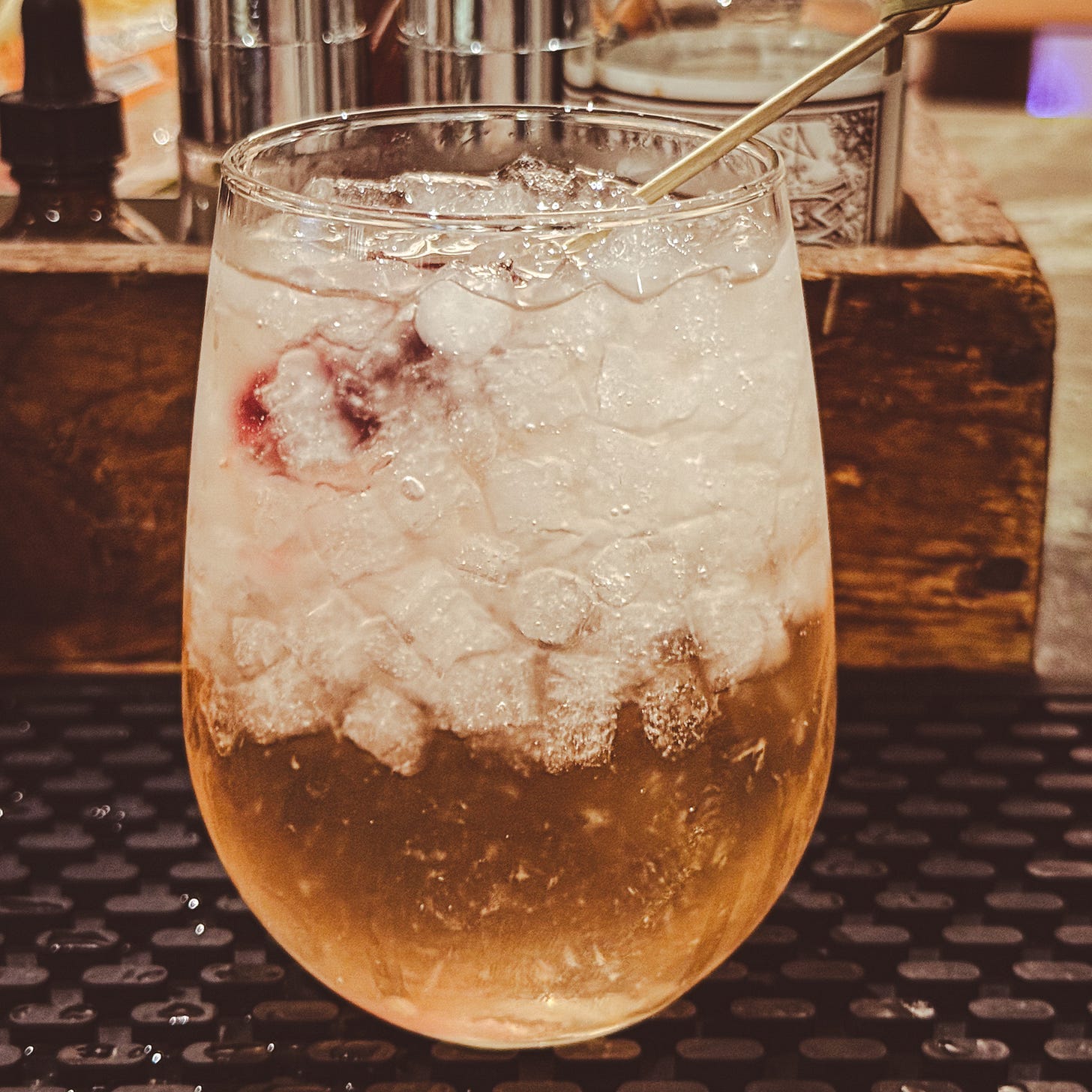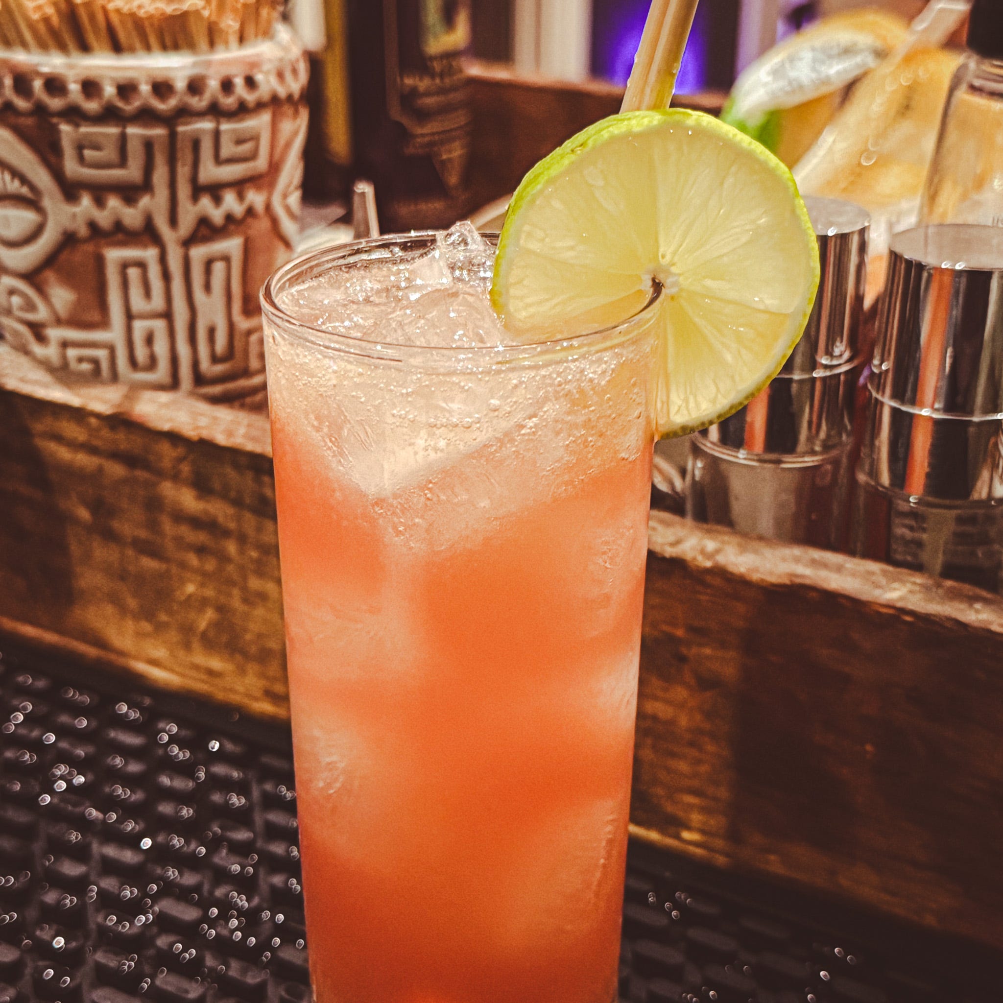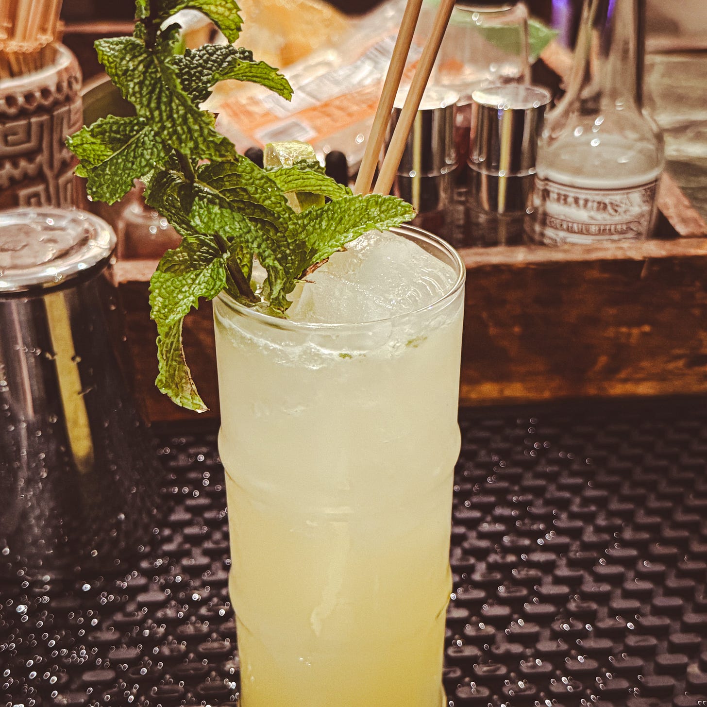 This is a solid riff on a Moscow Mule, with muddled mint and pear adding a nice freshness. Per official and fan photos, it is definitely served in a highball glass rather than a traditional copper mule mug, so I stuck with that here.