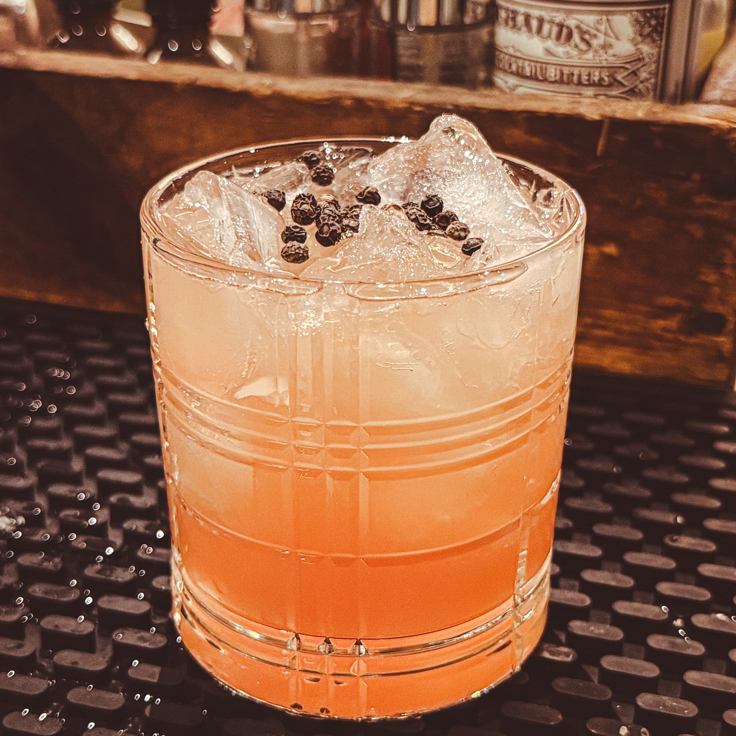 Shake all ingredients with ice. Strain into an old fashioned glass filled with ice. Garnish with a sprinkle of peppercorns.