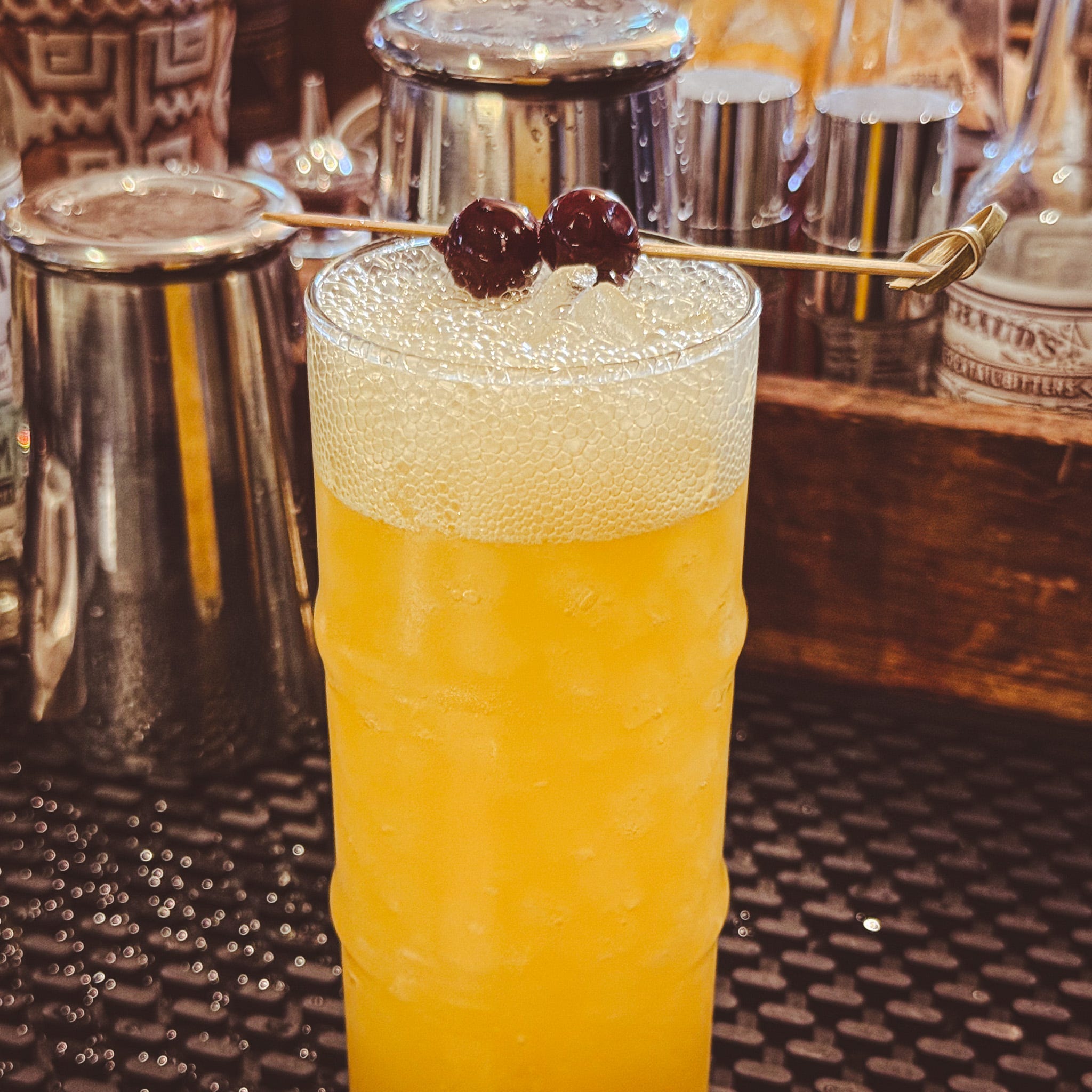 Official description: Malibu Pineapple Rum and Leblon Cachaça with Orange, Passion Fruit, and Mango Juices ($17.50)